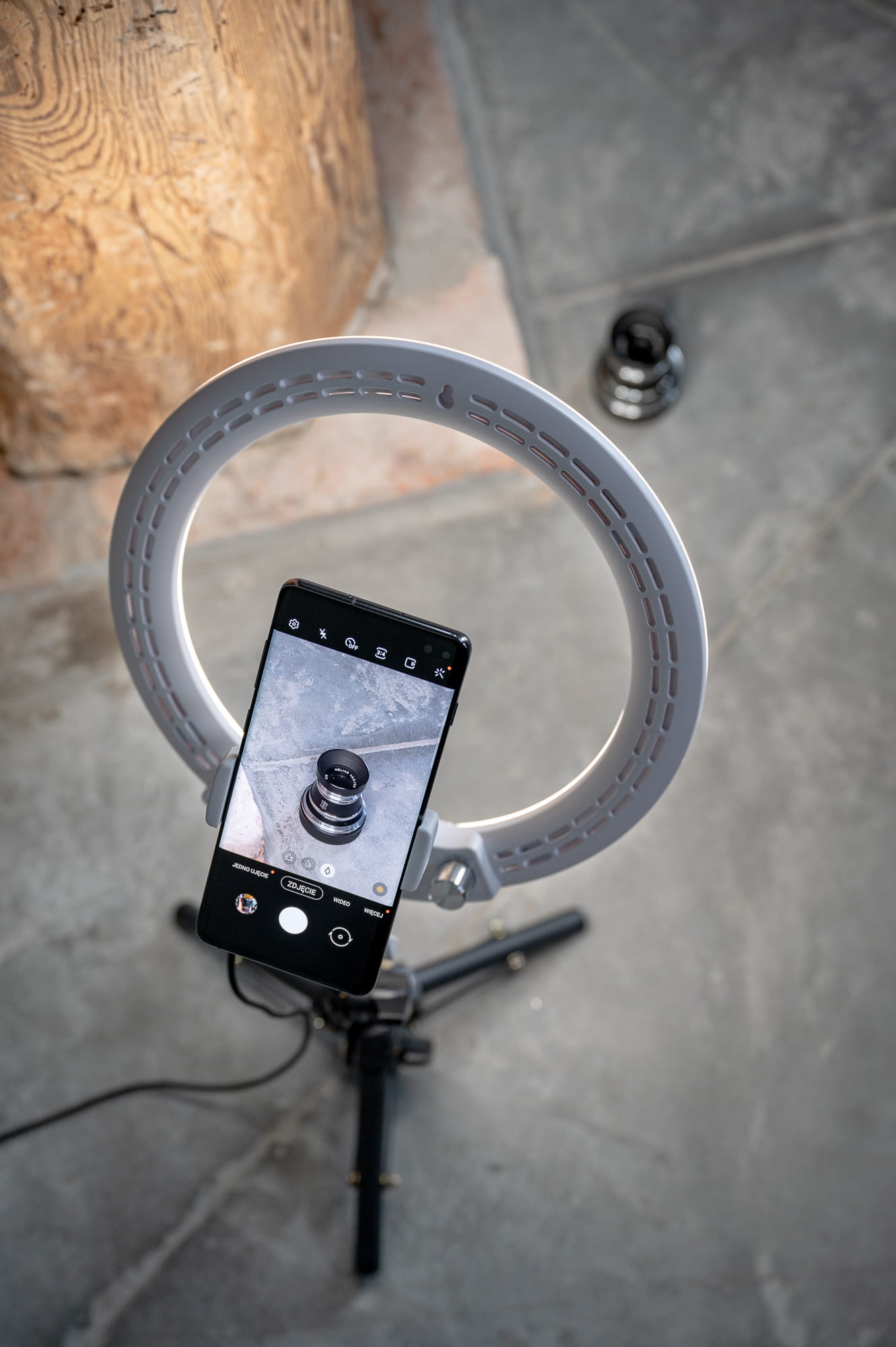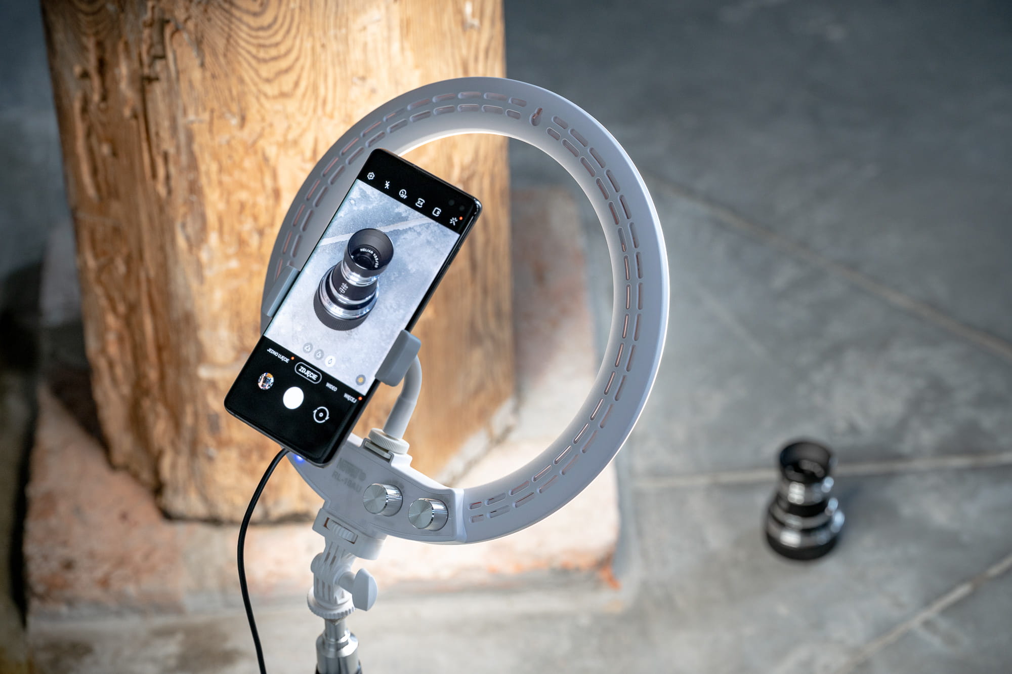 Lampę wyposażono w niewielką prowadnicę umożliwiającą wpięcie uchwytu na smartfon lub aparat. Oba te akcesoria znajdziesz w zestawie, dzięki czemu urządzenie będzie gotowe do użycia zaraz po rozpakowaniu. Uchwyt na smartfon wyposażono w elastyczne ramię i głowicę kulową. Dzięki temu precyzyjnie ustawisz kadr niezależnie od tego, co będzie tematem Twojego zdjęcia!