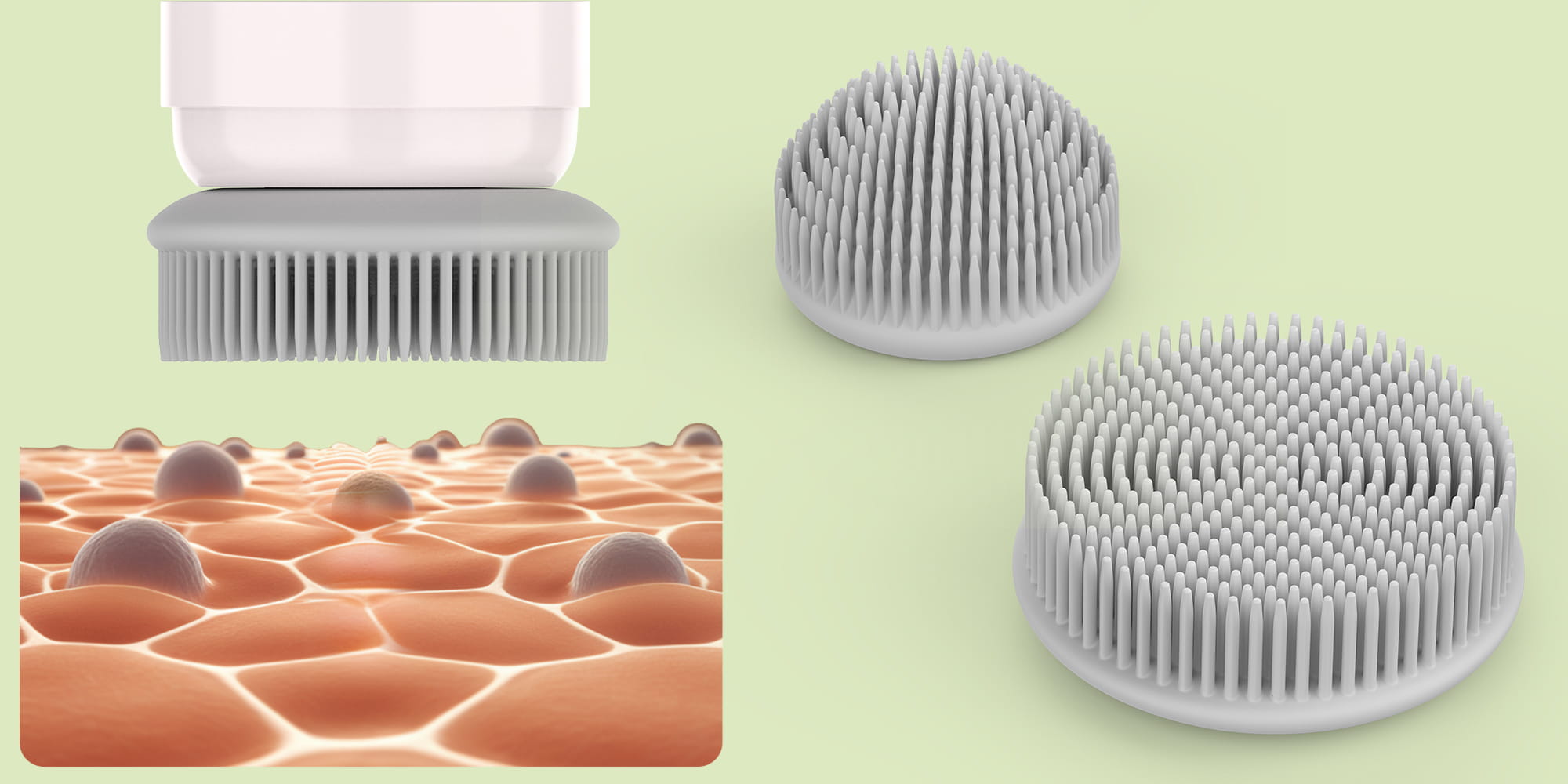 - Głowica płaska – masuje większe powierzchnie twarzy łagodnym, równomiernym ruchem. Sprawdzi się przy codziennym oczyszczaniu, wygładzaniu i usuwaniu pozostałości po kremach lub podkładzie.