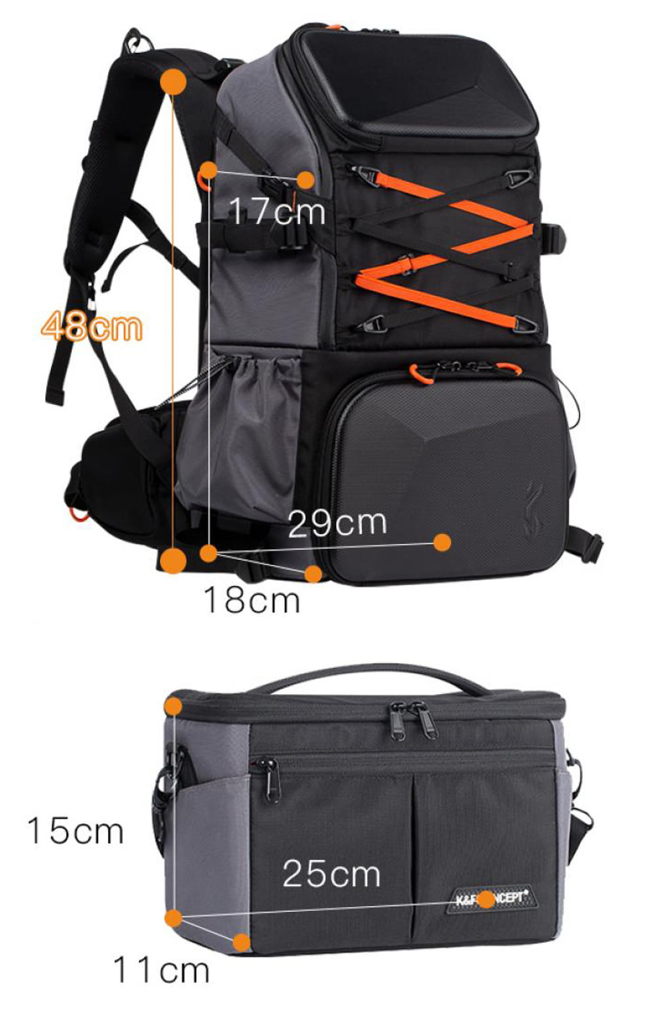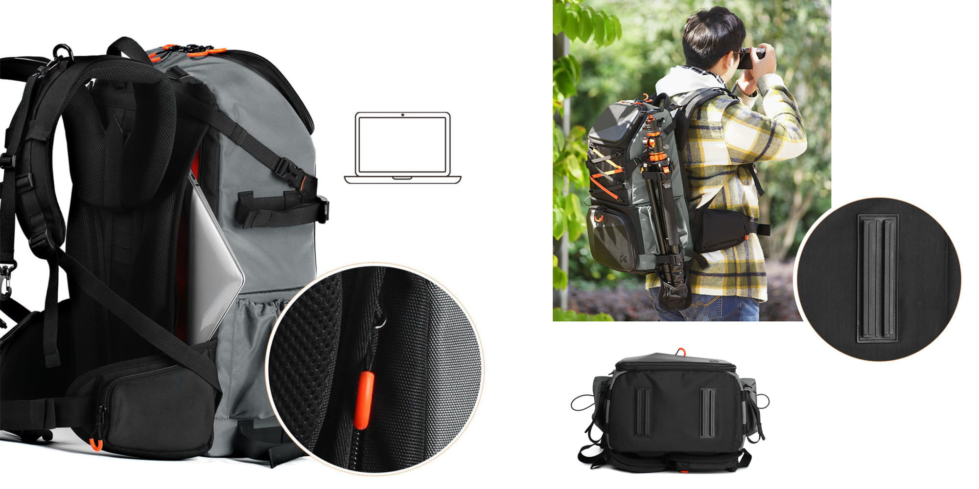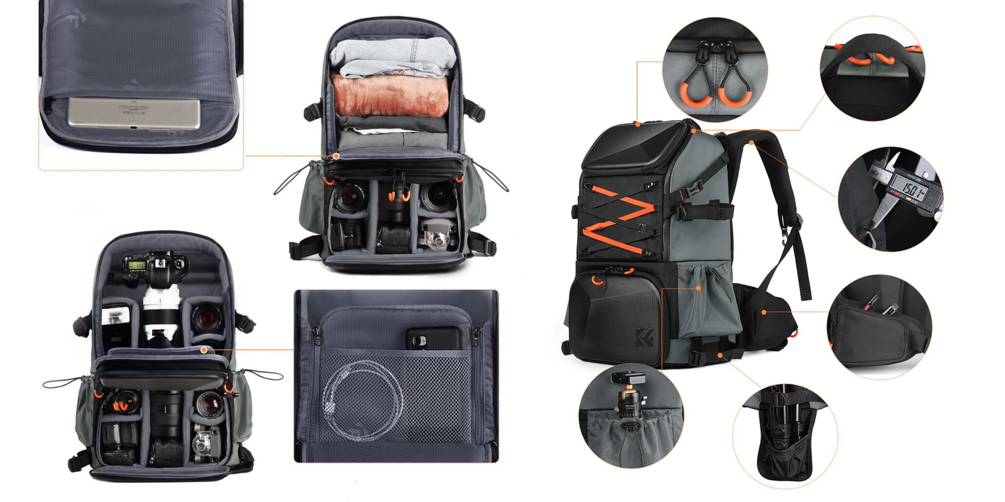 Plecak fotograficzny K&F Concept Star Wander 03 wyposażono w praktyczne kieszenie: na laptopa do 15,6”, na tablet, drobniejsze akcesoria i ubrania. Górna przegroda pomieści zestaw do czyszczenia, filtry, dokumenty lub przekąski, a dolna – cały Twój sprzęt foto-video. Z boku znajduje się ukryty wspornik do statywu, a na froncie dyskretna kieszeń na drobiazgi. Dzięki przemyślanemu układowi wszystko ma swoje miejsce, co pozwala błyskawicznie sięgnąć po to, czego potrzebujesz.