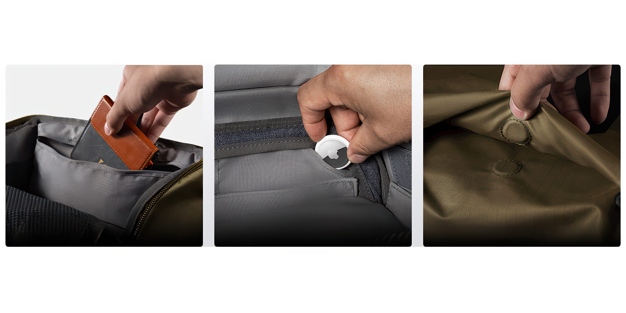 wewnętrzne kieszenie na karty pamięci, filtry, AirTag i drobiazgi