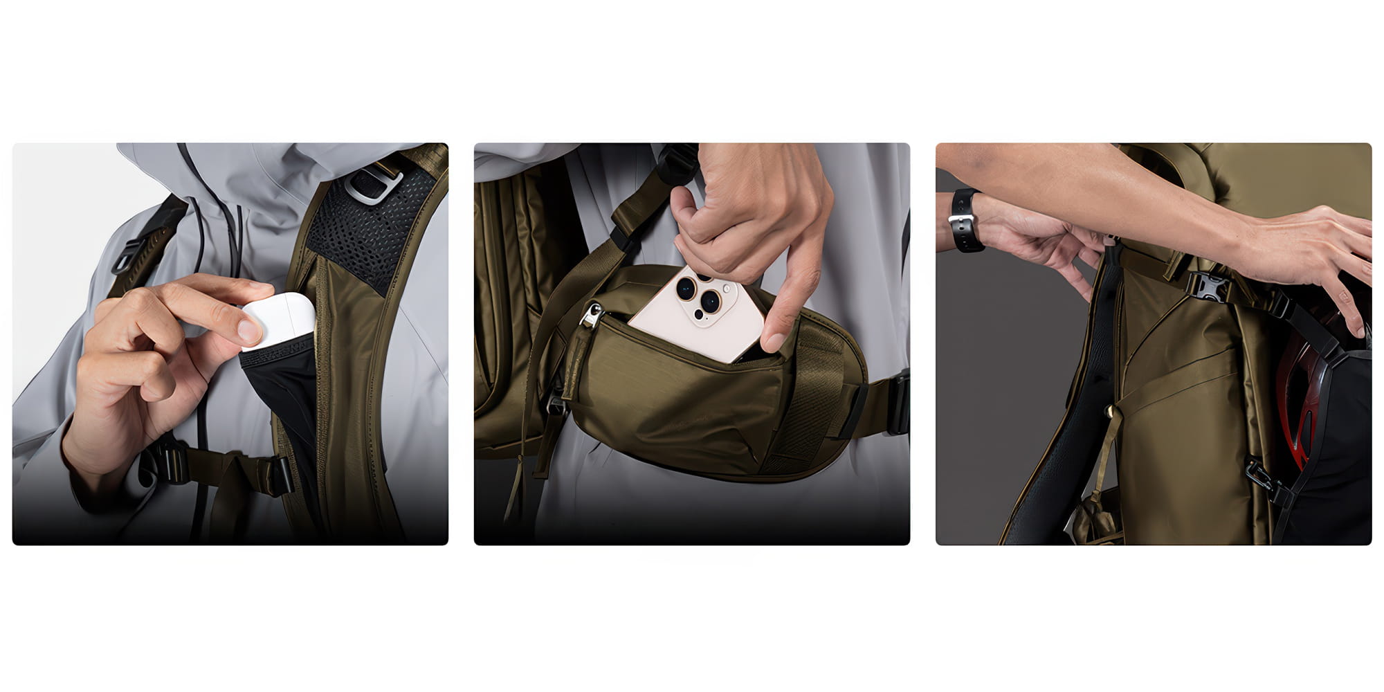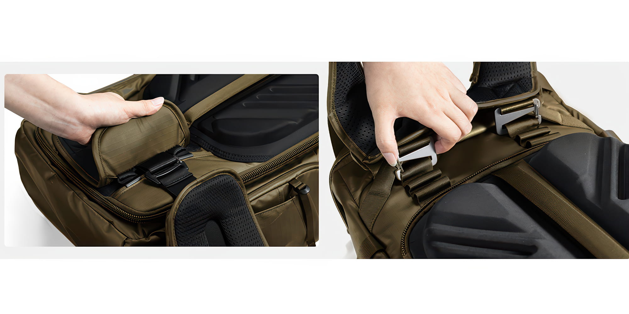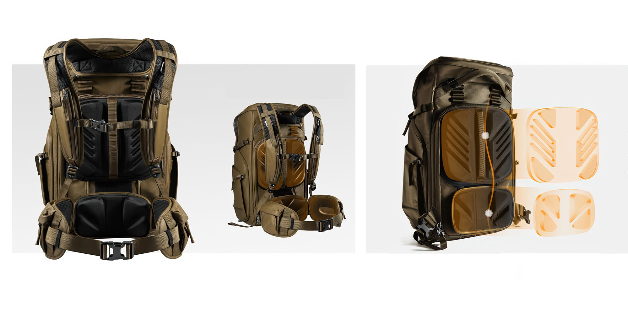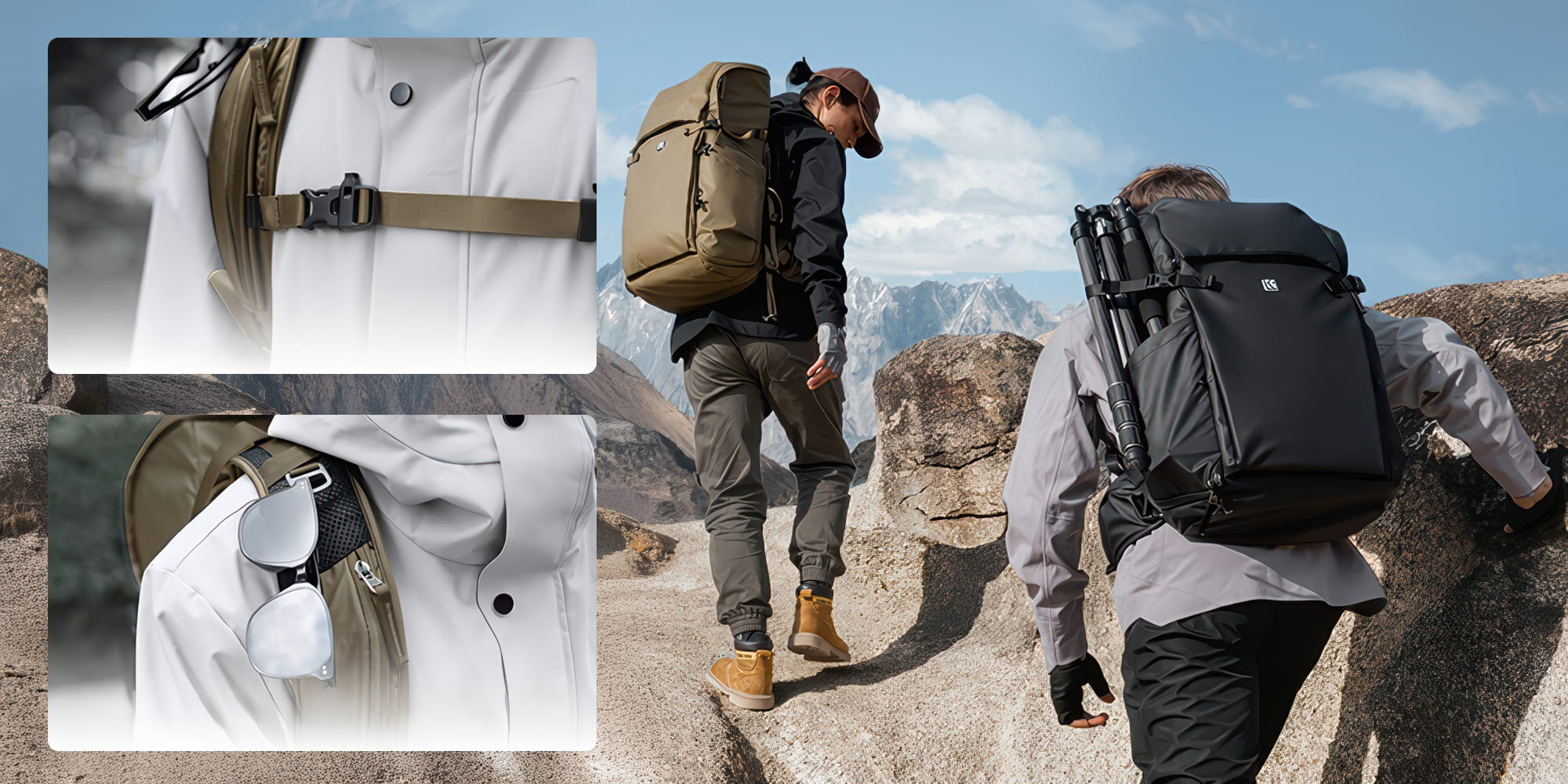 K&F Concept Star Wander 04 oferuje bezpośredni dostęp do głównej komory przez zamek umieszczony z prawej strony – wystarczy jeden ruch, by sięgnąć po aparat bez konieczności zdejmowania plecaka. W tylnej części znajduje się osobna, amortyzowana przegroda na laptopa do 15”, a kieszenie w pasie biodrowym, na szelkach i w klapie górnej pozwalają przechowywać drobne akcesoria – karty pamięci, power bank czy okulary. Dodatkowa torba przeznaczona specjalnie do przechowywania akumulatorów pozwala zachować porządek i kontrolę nad energią w terenie.