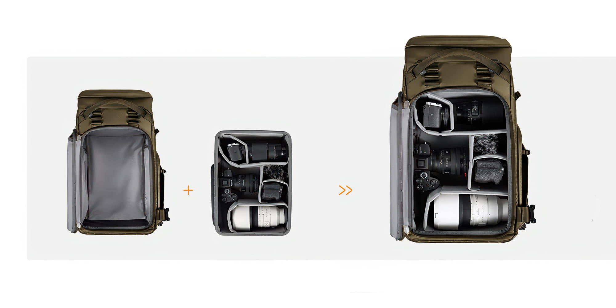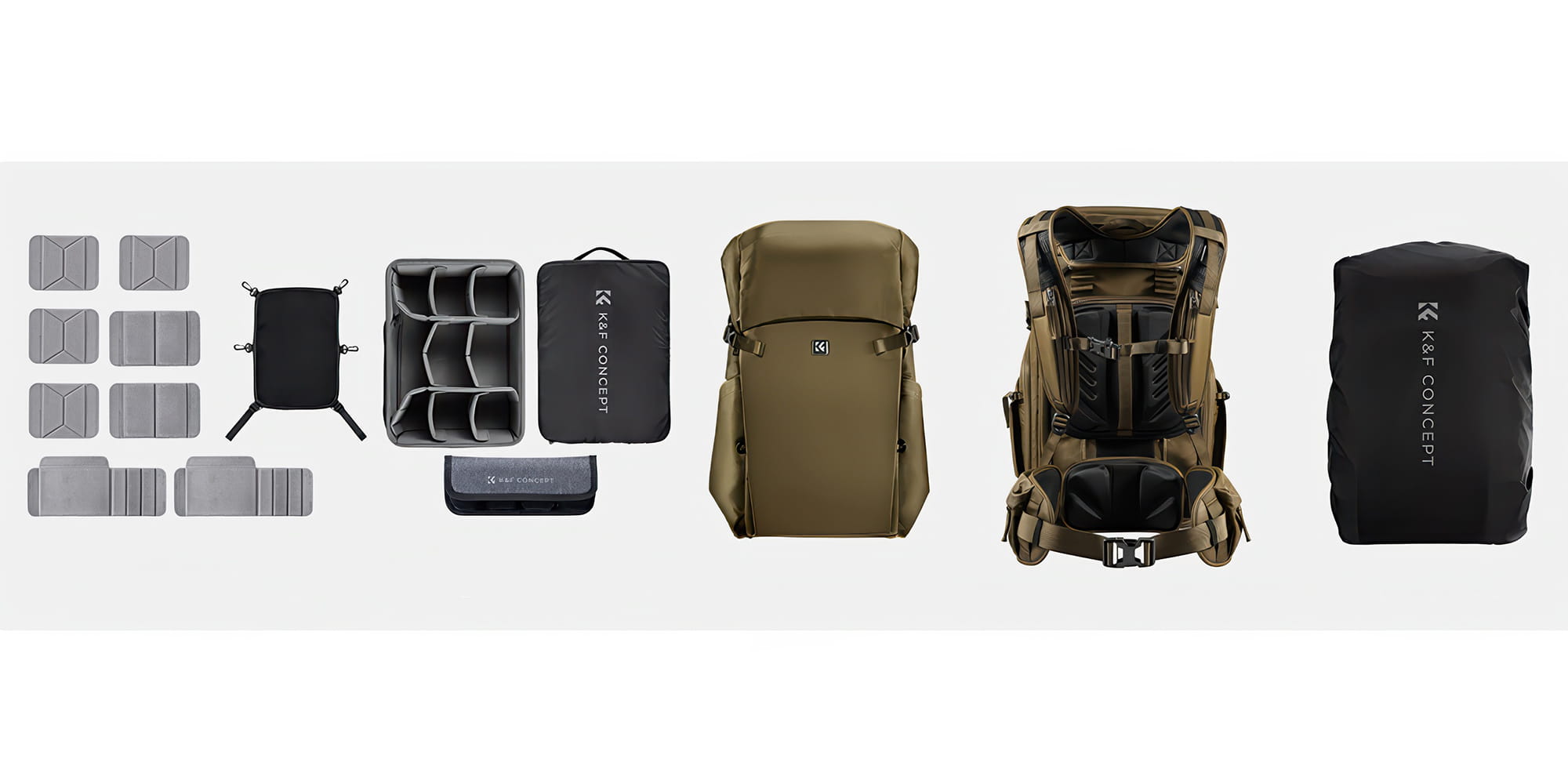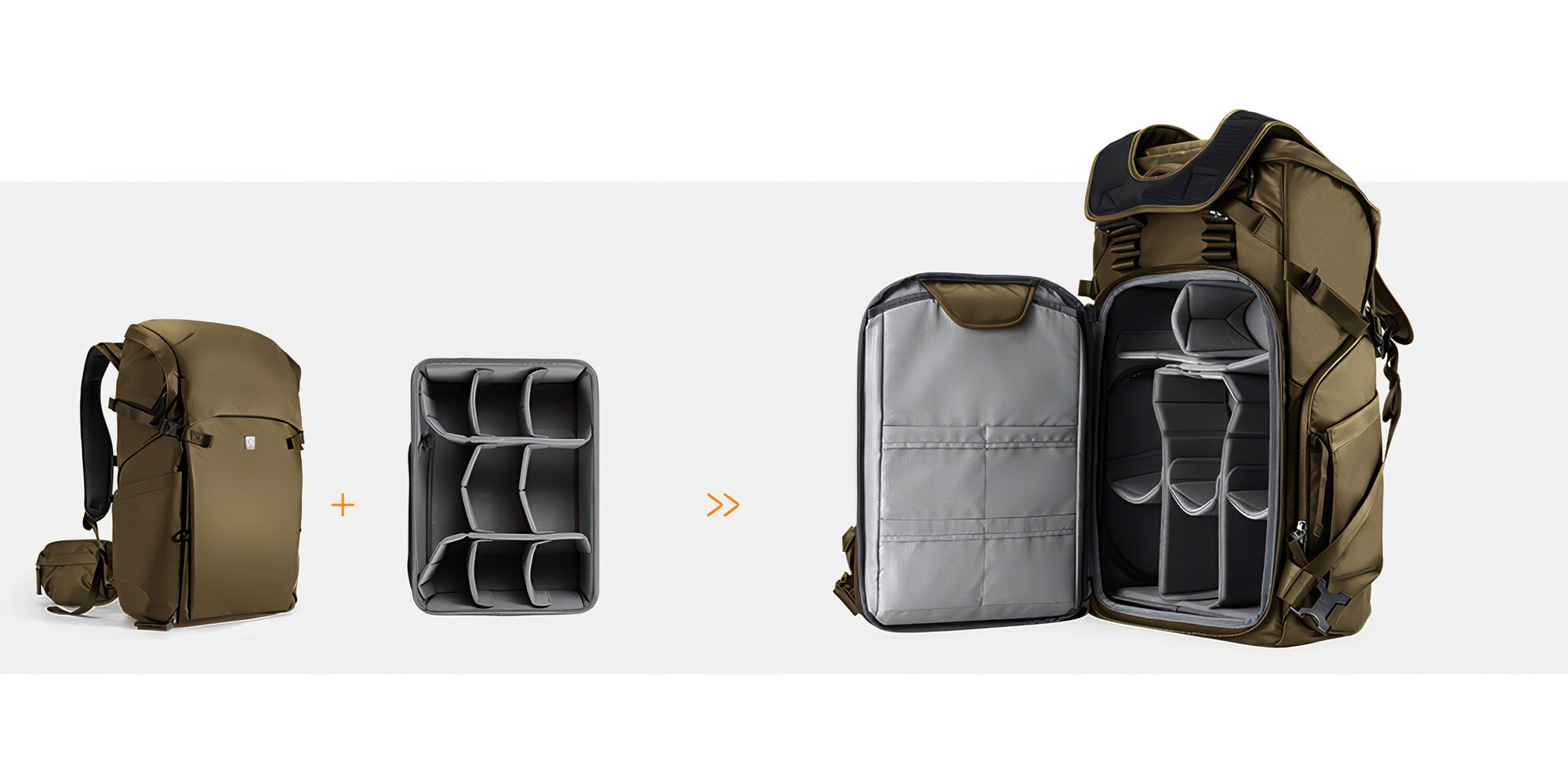 Plecak fotograficzny K&F Concept Star Wander 04 został zaprojektowany z myślą o elastycznym zarządzaniu przestrzenią w każdych warunkach. W jego wnętrzu znajdziesz profesjonalny wkład fotograficzny z ośmioma przegródkami (4 małe, 2 średnie i 2 duże), które możesz dowolnie przestawiać, by dopasować go do konkretnego zestawu sprzętu. Z powodzeniem pomieści kilka aparatów, obiektywy, drona oraz akcesoria. Po wyjęciu wkładu, który może działać niezależnie, plecak zamienia się w klasyczny bagaż – codzienny lub podróżny.