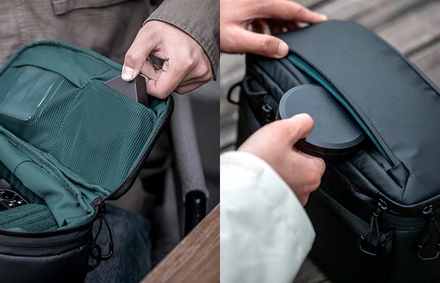 - Liczne kieszenie: Ułatwiają przechowywanie drobnych akcesoriów, takich jak kable, akumulatory, karty pamięci, smartfon czy AirTag.
