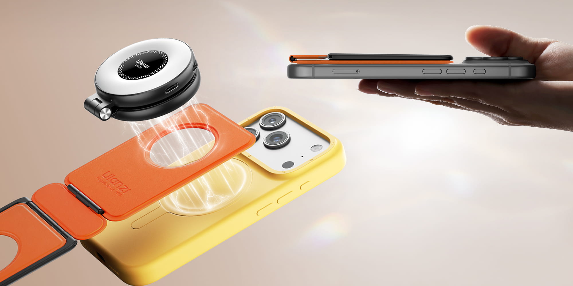 Przyczepianie statywu Ulanzi PS01 do telefonu zajmuje dosłownie sekundę. Wystarczy zbliżyć go do smartfona lub etui zgodnego ze standardem MagSafe. Nie musisz dokręcać śrubek, szukać odpowiedniego kąta ani kombinować z klipsami. Klik – i możesz działać dalej. W tylnej części statywu znajdziesz też dodatkowy magnes, dzięki któremu możesz połączyć z telefonem dodatkowe akcesorium z pierścieniem magnetycznym, np. lampkę LED Ulanzi LM19.