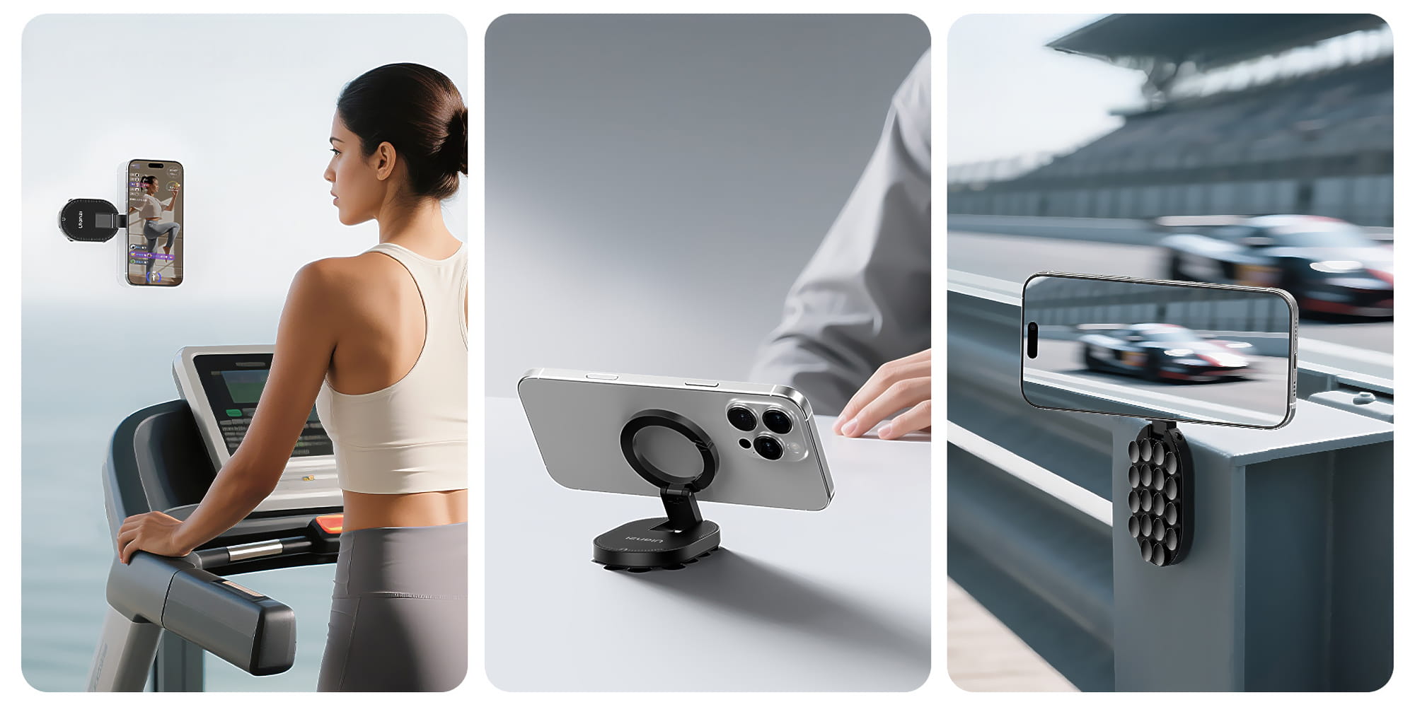 - Tryb magnetyczny – magnetyczna podstawa umożliwia przyczepienie uchwytu do metalowych powierzchni: słupków, poręczy, regałów, sprzętu fitness czy metalowych drzwi, a także smartfonów z pierścieniem MagSafe.