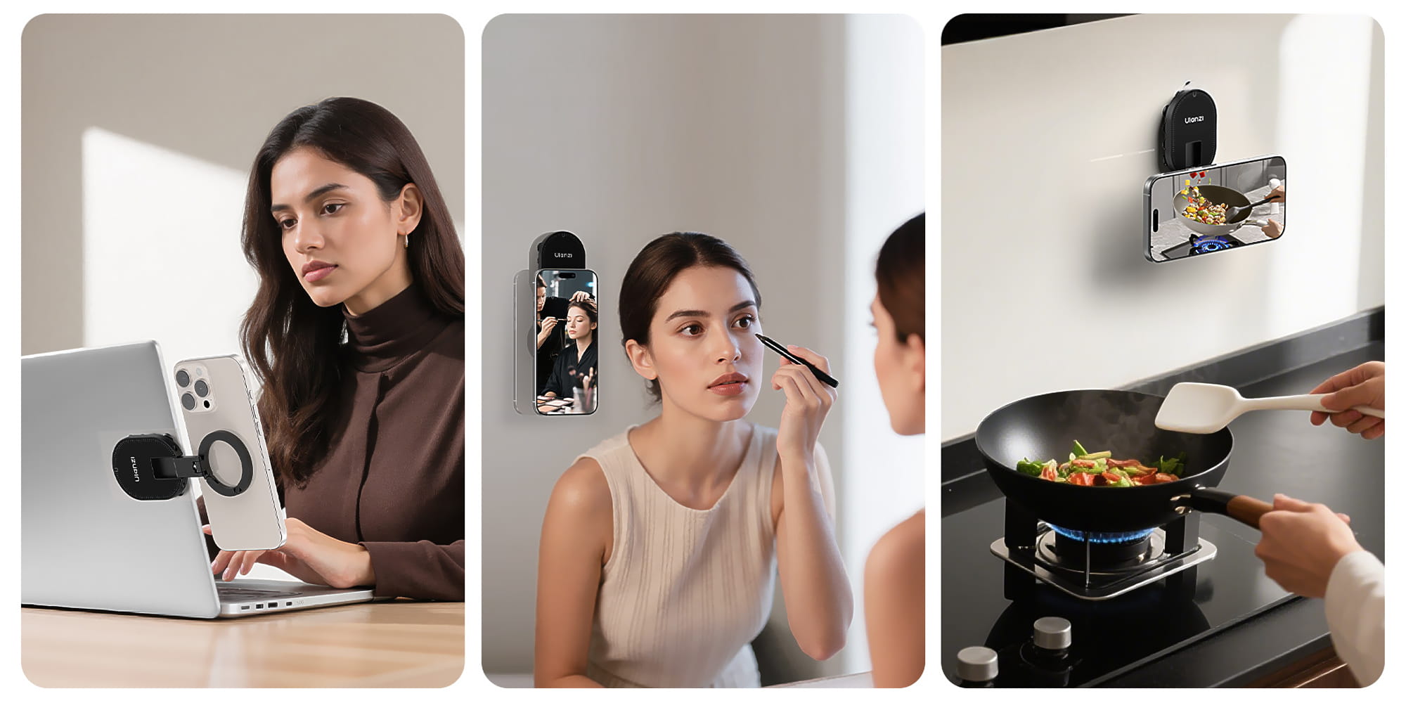 Magnetyczna podstawa otwiera zupełnie nowe możliwości ustawienia kadru – od nagrań na siłowni, w garażu czy warsztacie, po ujęcia w kuchni na metalowych urządzeniach AGD. Dzięki Ulanzi MA39 telefon zawsze jest stabilnie zamocowany dokładnie tam, gdzie go potrzebujesz.